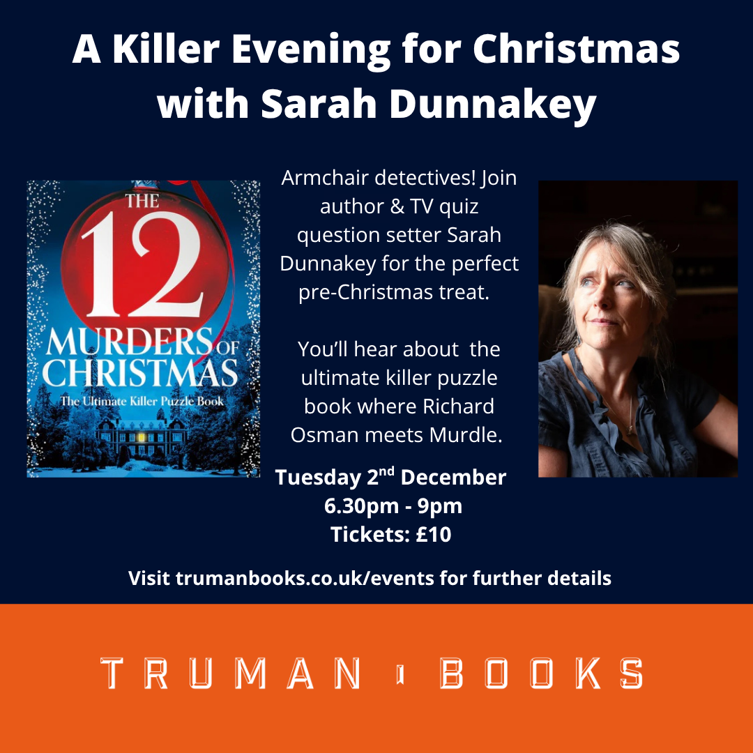 This is the content for Layout P Tag Truman Books 95 Town Street, Farsley, Leeds Armchair detectives! Join author & TV quiz question setter Sarah Dunnakey for the perfect pre-Christmas treat. This December, head to the bookshop to find out more about The 12 Murders of Christmas – the ultimate killer puzzle book where Richard Osman meets Murdle. Sarah will give us an insight into how she put together this exciting book … Get Tickets here £10.00